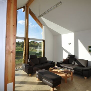 - riesiger Wohn-Küchen-Essbereich mit Eckkamin, offenem Luftraum bis in den Dachgiebel, große Schlaf- und Kinderspielempore mit Doppelbett in Überlänge 220 cm sowie großzügige Panorama-Glasfronten in die offene Parklandschaft, zwei Terrassentüren mit Fliegengittern;
